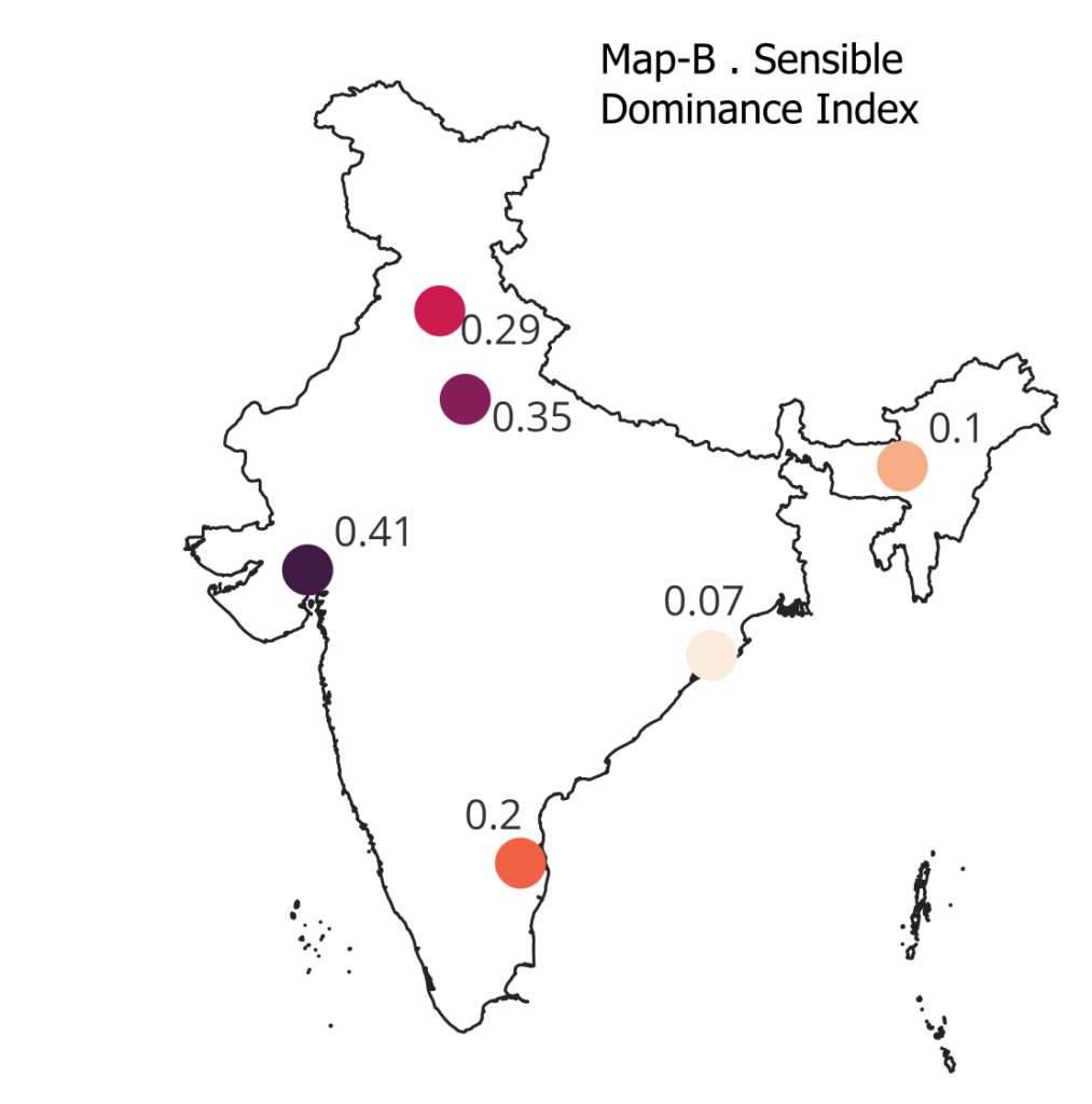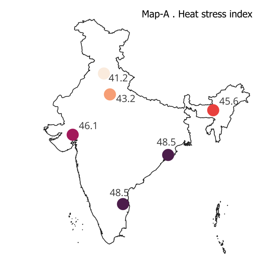The map-A, shows clear spatial variation in peak daytime heat stress across india. coastal and humid stations such as Bhubaneswar and Tirupati record the highest heat stress index values (around 48.5), indicating strong combined effects of temperature and humidity. Ahmedabad also shows high heat stress (46.1), driven mainly by high temperature rather than humidity.Guwahati records moderately high heat stress (45.6), reflecting humid but relatively lower temperatures. in contrast, Chandigarh (41.2) and Jewar/western up (43.2) show lower heat stress, suggesting comparatively reduced peak cooling pressure. overall, the map highlights that heat stress is not controlled by temperature alone; humidity significantly elevates stress levels in coastal and eastern regions, increasing cooling and energy demand for industrial operations.