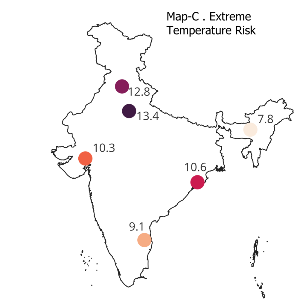 The map shows that Jewar/western up (13.4 °C) and Chandigarh (12.8 °C) experience the highest extreme temperature risk, indicating large heat-wave departures above normal daytime temperatures. Bhubaneswar (10.6 °C) and Ahmedabad (10.3 °C) also show substantial extreme risk, reflecting strong but more frequent high-temperature conditions. Tirupati (9.1 °C) records slightly lower extreme deviation, while Guwahati (7.8 °C) shows the lowest extreme temperature risk due to comparatively moderated maximum temperatures. overall, the map highlights that northern inland locations face the most severe heat-wave spikes, which increase peak cooling demand, redundancy requirements, and operational risk despite lower average temperatures in some cases.