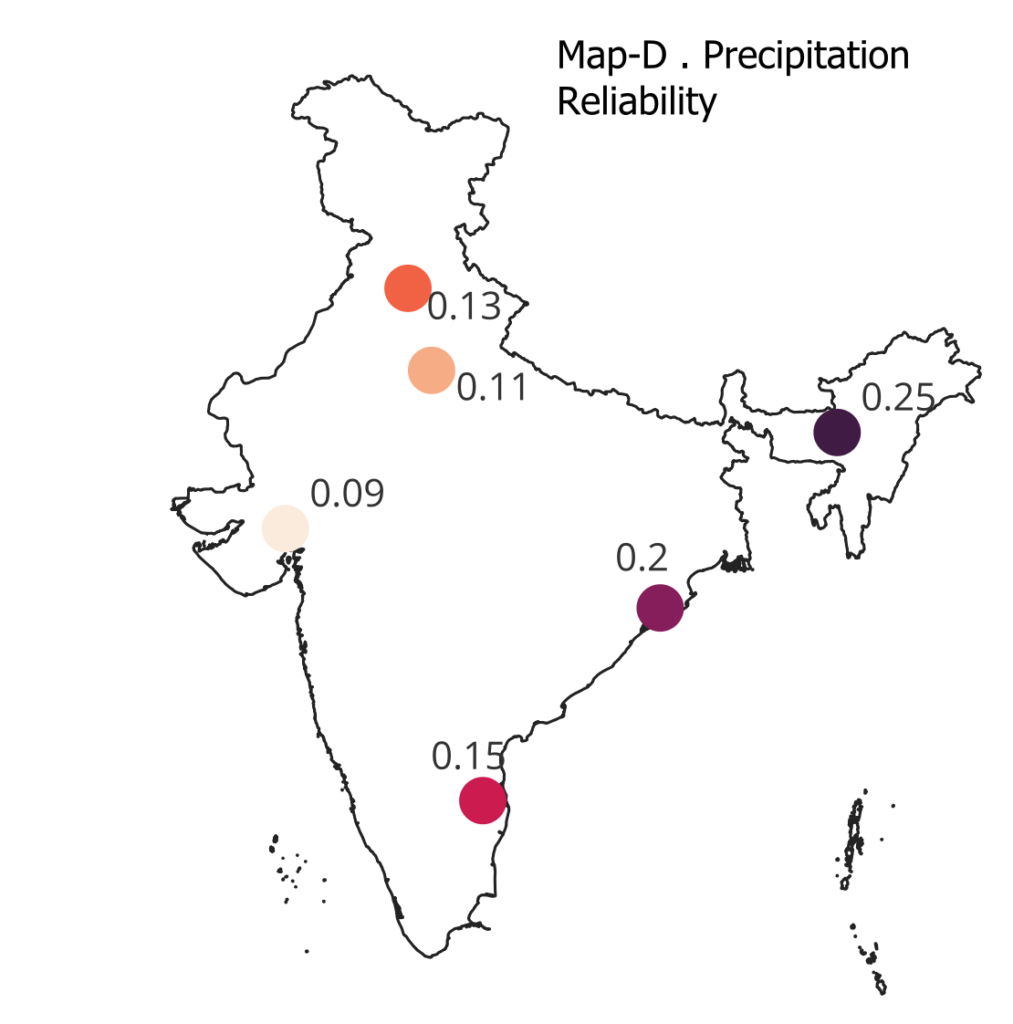 The map shows strong spatial contrast in water reliability across stations. GUWAHATI records the highest precipitation reliability (0.25), indicating dependable rainfall and lower structural water stress. BHUBANESWAR (0.20) and TIRUPATI (0.15) show moderate reliability, suggesting adequate but seasonally concentrated water availability. CHANDIGARH (0.13) and JEWAR / WESTERN UP (0.11) fall into a lower reliability zone, implying higher dependence on storage, recycling, and external water supply. AHMEDABAD shows the lowest precipitation reliability (0.09), highlighting chronic water scarcity and the highest pressure on engineered water infrastructure. overall, the map confirms a clear west–east gradient, with inland western locations facing the greatest water-security challenges for industrial operations.