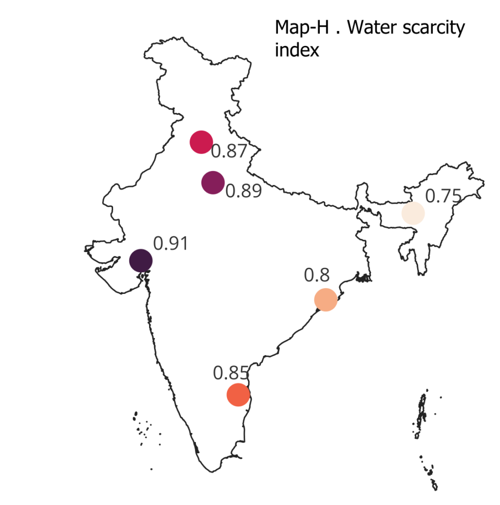 The map highlights strong spatial variation in water stress across india. AHMEDABAD shows the highest water scarcity (0.91), confirming severe and persistent water stress and heavy reliance on external water infrastructure. JEWAR / WESTERN UP (0.89) and CHANDIGARH (0.87) also experience high water scarcity, indicating significant pressure on groundwater extraction and recycling systems. TIRUPATI (0.85) represents moderately high scarcity, reflecting seasonal rainfall concentration rather than consistent availability. BHUBANESWAR (0.80) shows lower but still notable water stress. in contrast, GUWAHATI records the lowest WSI (0.75), indicating comparatively reliable natural water availability. Overall, the map demonstrates a clear west–east gradient, with inland and western locations facing the greatest water-security challenges for semiconductor operations.
