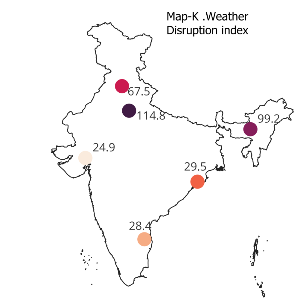 The map shows strong regional contrasts in operational disruption risk. JEWAR / WESTERN UP records the highest WDI (114.8), driven by very frequent fog and thunderstorms, making it the most disruption-prone location among the stations. GUWAHATI follows closely with a WDI of 99.2, reflecting intense convective activity and persistent fog. CHANDIGARH (67.5) shows moderate-to-high disruption risk, largely associated with winter fog events. in contrast, BHUBANESWAR (29.5), TIRUPATI (28.4), and especially AHMEDABAD (24.9) exhibit much lower disruption indices, indicating relatively stable operational conditions. overall, the map highlights that northern and northeastern locations face the greatest weather-related operational risks, independent of their thermal stress levels.