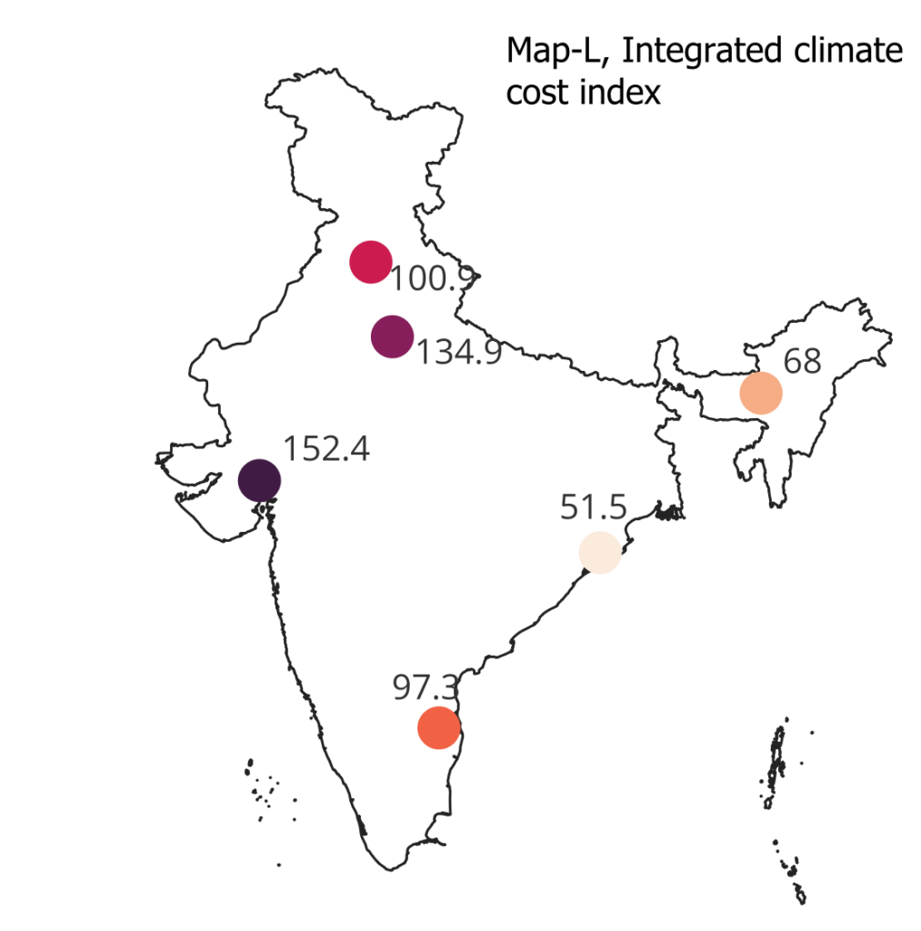 The map reveals clear spatial contrasts in overall climate-related cost burden. AHMEDABAD records the highest TCCI (152.4), reflecting the combined impact of extreme sensible cooling demand and severe water scarcity. JEWAR / WESTERN UP (134.9) also shows very high integrated cost due to strong cooling requirements coupled with exceptionally high weather disruption risk. CHANDIGARH (100.9) and TIRUPATI (97.3) occupy an intermediate position, where moderate cooling demand is amplified by either water stress or operational disruptions. GUWAHATI (68) and especially BHUBANESWAR (51.5) show substantially lower integrated climate costs, indicating more favourable overall climatic conditions despite humidity-related challenges. overall, the map demonstrates that total climate cost is not controlled by a single factor but emerges from the interaction of heat, water availability, and weather variability, with inland western and northern locations facing the greatest combined burden.
